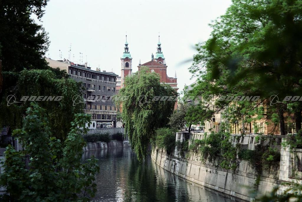 The Ljubljanica river flows through the center of Ljubljana, or Laibach, the capital city of Slovenia. Ljubljana is an ancient city situated in the middle of Slovenia between the Alps and the Mediterranean Sea. The red Baroque building is a Franciscan church, the Church of the Annunciation (Marijino oznanjenje), which was built in the 1600s.
