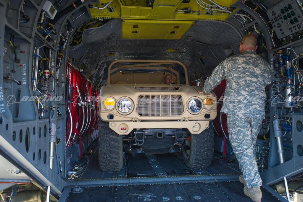 An Army loadmaster guides a soldier driving a Boeing Phantom Badger aboard a CH-47 Chinook in April 2014. Phantom Badger is a rugged combat support vehicle that features a modular design to provided added mission flexibility for the warfighter. It was certified for internal transport aboard the V-22 and CH-47 in 2014. Two Phantom Badgers can fit inside a CH-47.