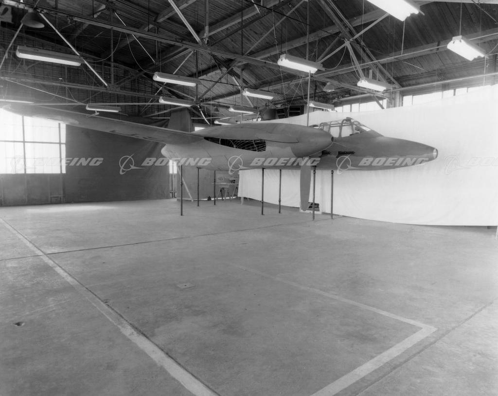 The XP-67 was McDonnell's only propeller-powered fighter. On Aug. 14, 1941, the U.S. Army Air Forces placed its first order with the tiny McDonnell Aircraft Corp. for two prototypes of a novel, twin-engine, long-range fighter with a pressurized cabin. Engineers tried to improve the airplane's aerodynamics by merging the center fuselage with rear portions of the engine nacelles. This resulted in the XP-67's unique bat-like shape. The turbo-supercharged 12-cylinder, inverted-V, liquid-cooled engines would be housed in long nacelles and would drive four-blade propellers in opposite directions. They were to maximize the use of exhaust to increase engine thrust. The XP-67 was completed in St. Louis, Mo., in December 1943, but the temperamental engines caused the airplane's first flight to last only six minutes. Problems continued with the engines, and the XP-67's top speed was 200 mph slower than required. The second prototype was never finished.