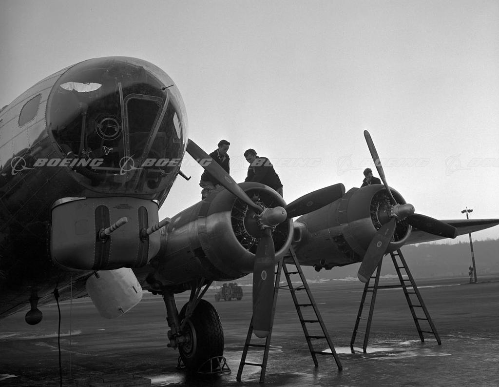 Boeing Flying Fortresses parked in line on the flight apron at the Boeing Plant in Seattle present interesting silhouettes in the half light of a chill January dawn. the big bombers await last-minute checkups before they wing their way to distant battle skies.
