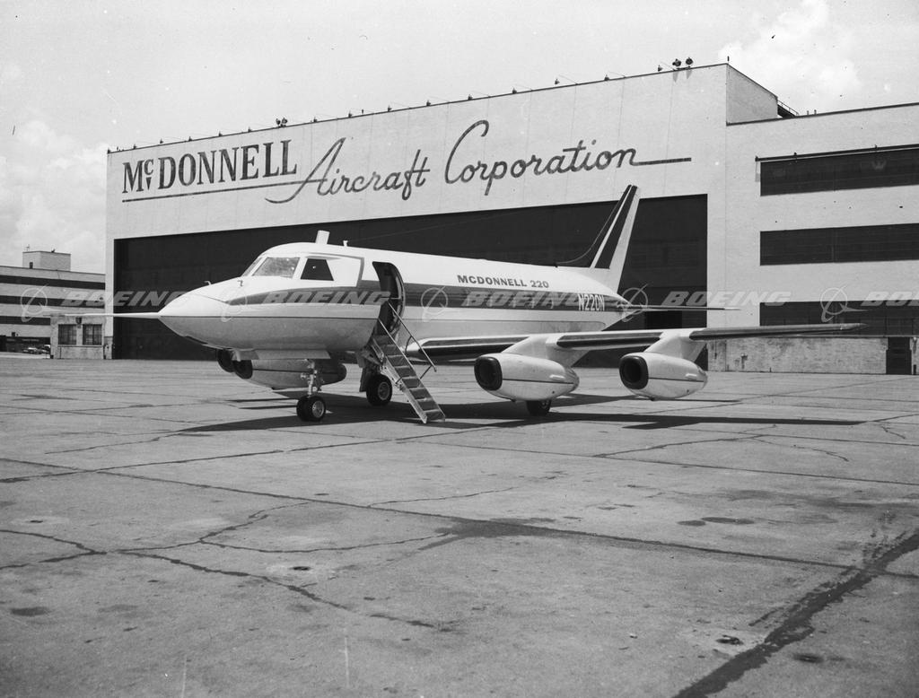 The McDonnell Model 119 was designed and built in response to a 1956 Air Force competition for a UCX utility aircraft. The Model 119 was a four-engine turbo-jet powered low-wing monoplane with a tricycle landing gear that was designed to accomodate a ten passengers and a crew of two. When McDonnell lost the Air Force contract to Lockheed, the company tried to market the airplane as a commercial business jet called the Model 220. The four-engine Model 119/220 was the first business, non-airline-type jet aircraft to receive an FAA Class I provisional type certificate as airworthy in the transport category.