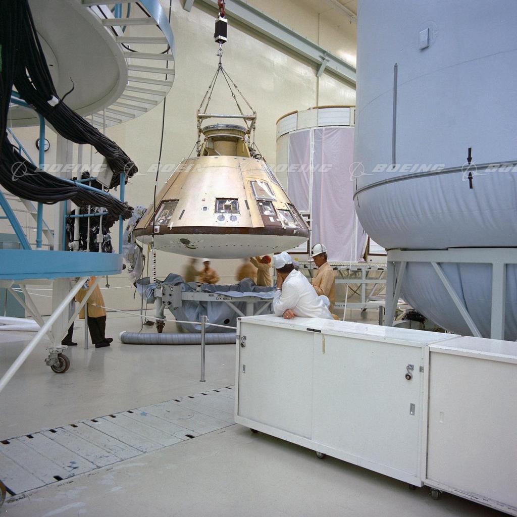 All the major sections of the Apollo spacecraft and launch vehicle, with the exception of the Grumman-built Lunar Module, were developed and built by companies that would later join to form 21st century Boeing. These companies had a common customer, NASA, which led the U.S. effort to put a man on the Moon and return him safely to Earth. The Apollo command and service modules were built at North American Aviation's plant at Downey, California.