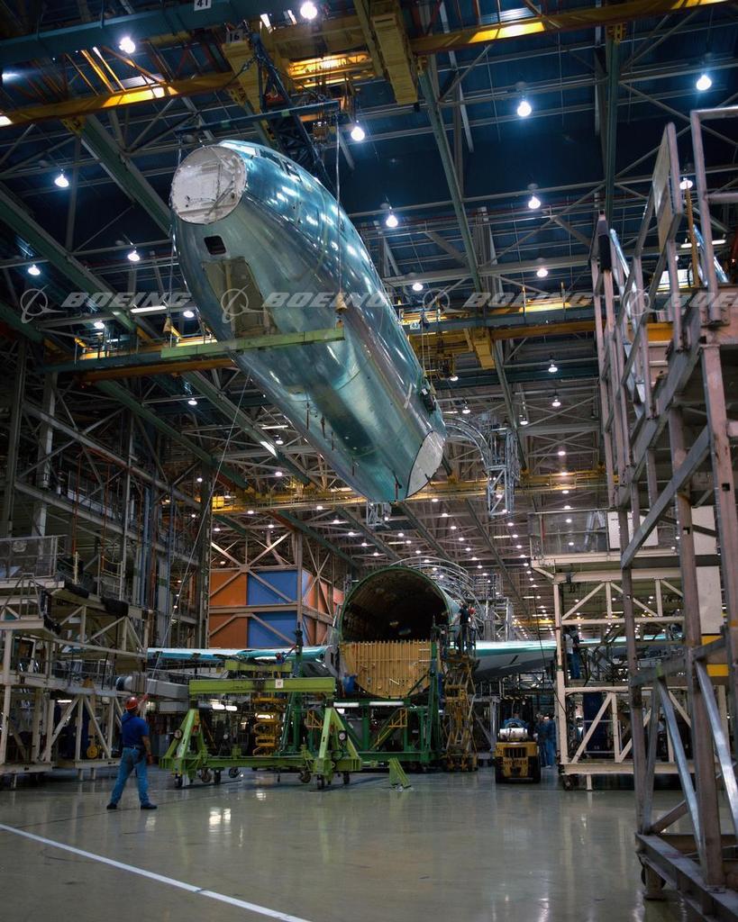 The Boeing 767 family is a complete family of airplanes providing airlines with maximum versatility in the 200 to 300-seat market. It includes three passenger models - the 767-200ER, 767-300ER and 767-400ER - and a freighter, which is based on the 767-300ER fuselage. The 767-200ER has a range of more than 7,500 miles and the 767-300 freighter can haul 60 tons more than 3,700 miles. In 1997, Boeing launched the 767-400ER, which can take 304 passengers more than 7,000 miles. Military versions include the 767 AWACS, which first flew Aug. 9, 1996, and the 767 tanker/transport, launched in 2000, designed to replace the aging KC-135 aerial tankers. In March 2002, the 767 manufacturing program converted to a moving line system, replacing the old station to station method of assembly pictured here.