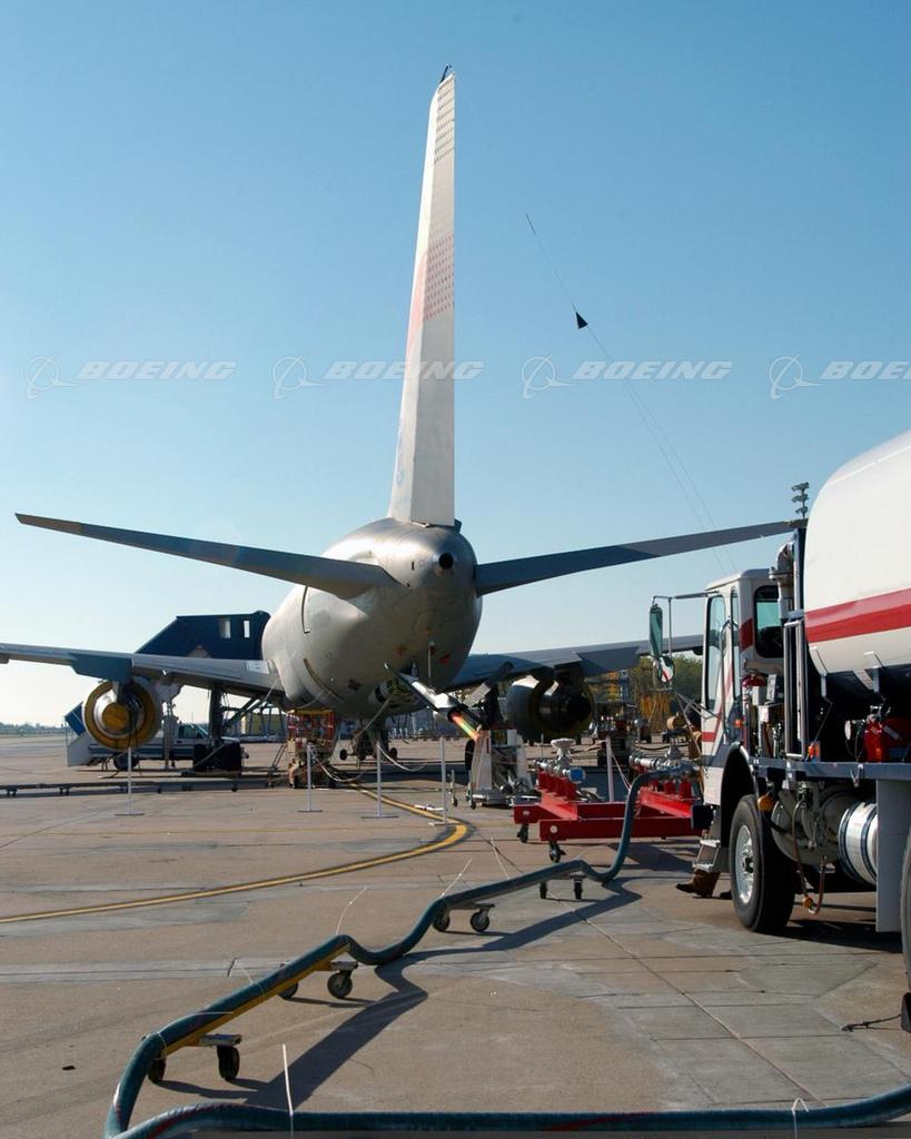 The Boeing KC-767 Tanker transfers fuel for the first time Oct. 23, 2006 from its advanced boom to a simulated receiver on the ground. Boom operators on-board the aircraft used the aerial refueling systems to offload fuel from the new tanker to an aircraft receptacle on the ground at the Boeing Integrated Defense Systems facility in Wichita, Kan. Fuel flow, delivery and surge pressure all were measured while the fuel was pumped to nearby trucks.