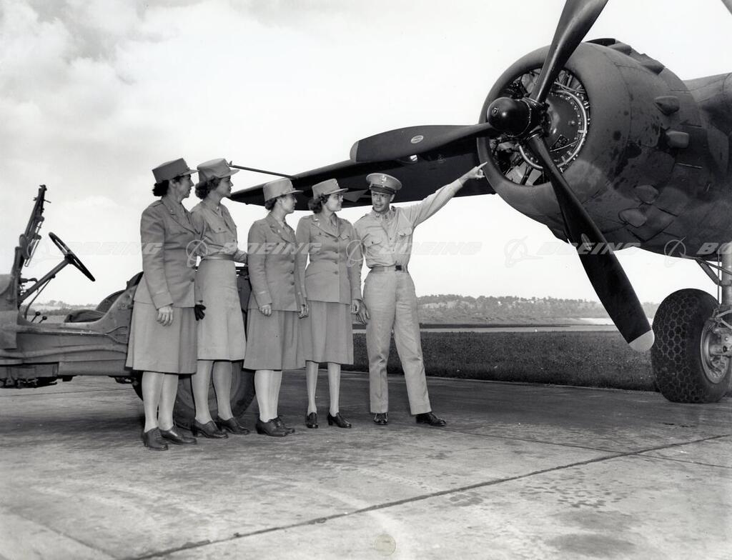 Women Pose for a Photo atop an Aircraft at North American Aviation