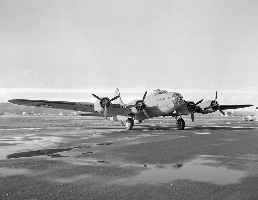 In response for the Army’s request for a large, multiengine bomber, the B-17 (Model 299) prototype, financed entirely by Boeing, went from design board to flight test in less than 12 months. The B-17 was a low-wing monoplane that combined aerodynamic features of the XB-17 giant bomber, still in the design stage, and the Model 247 transport. The B-17 was the first Boeing military aircraft with a flight deck instead of an open cockpit and was armed with bombs and five .30-caliber machine guns mounted in clear blisters. The B-17E, the first mass-produced model Flying Fortress, carried nine machine guns and a 4,000-pound bomb load. It was several tons heavier than the prototypes and bristled with armament. It was the first Boeing airplane with the distinctive - and enormous - tail for improved control and stability during high-altitude bombing. Each version was more heavily armed. In the Pacific, the planes earned a deadly reputation with the Japanese, who dubbed them four-engine fighters. The Fortresses were also legendary for their ability to stay in the air after taking brutal poundings. They sometimes limped back to their bases with large chunks of the fuselage shot off.