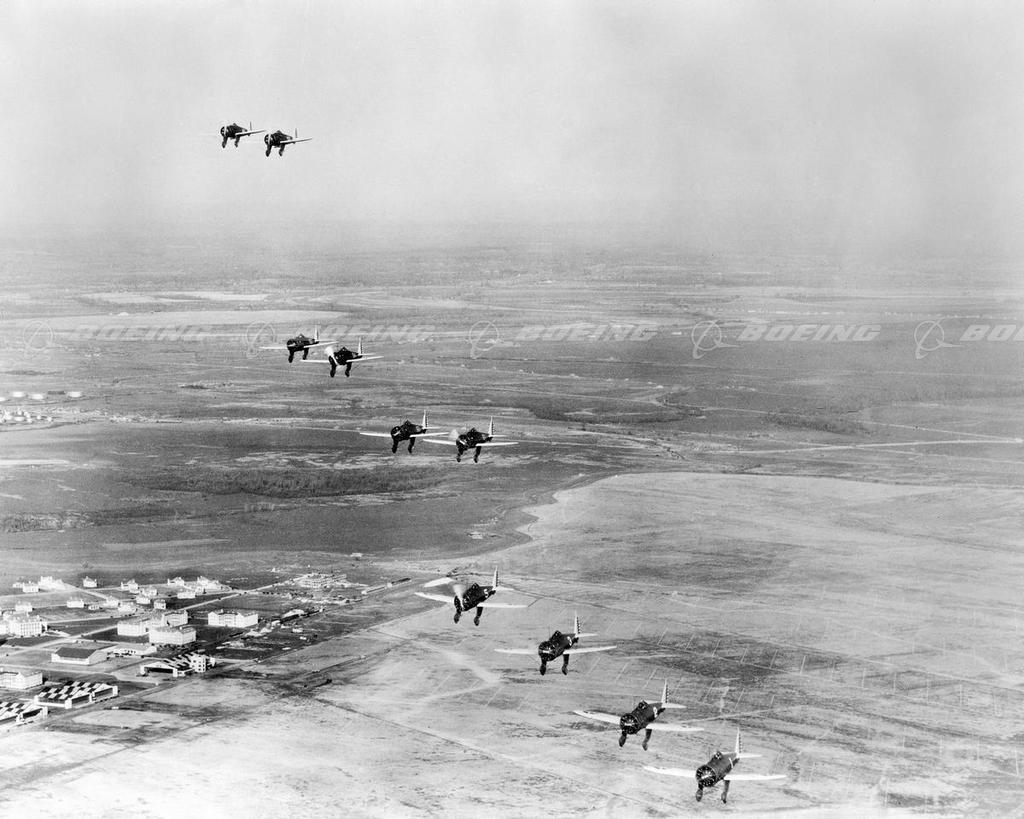 The plucky little P-26 “Peashooter” first flew March 20, 1932. It was the first Boeing all-metal, low-wing monoplane fighter with its wings braced by wires, rather than struts. Powered by a 600-horsepower engine, the 23-foot 7-inch long airplane could fly 234 mph. Its initial high landing speeds were reduced by the addition of wing flaps in the production models. The U.S. Army ordered 126 production-model P-26s, and Boeing built 12 for export. One of a group of P26As, turned over to the Philippine Army late in 1941, was among the first Allied fighters to down a Japanese airplane.