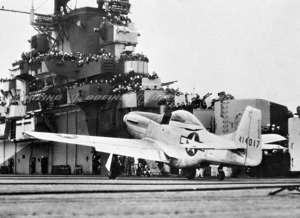 Lack of fighter escorts for B-29s was a concern for the USAAF as their missions approached mainland Japan. One idea was to have fighters launched from aircraft carriers located closer to Japan protect the bombers during the bombing raid. At that time no US Navy fighters had enough range to support the mission. The North American P-51 Mustang had become the premier long-range escort fighter by late 1943, but was not designed for carrier-based operations. A classified program “Project Seahorse” was approved and P-51D-5-NA, serial number 44-14017, was retained by North American Aviation in Dallas, Texas for modifications to create a navalized version of the P-51. Aerodynamic, structural and landing gear changes were incorporated and the aircraft was redesignated as the ETF-51D. After two months of testing at Mustin Field, PA the ETF-51D was transferred to the USS Shangri-La (CV-38) Essex class carrier undergoing a shakedown cruise off the coast of Virginia. Navy Lieutenant Robert Elder made the first P-51 carrier landing on November 15, 1943. The carrier suitability trials ended after only 25 landings and launches were made. The airfields on the islands of Okinawa and Iwo Jima were taken over by US forces in early 1945, providing fighter units with forward bases to escort the bombers to mainland Japan. Thus a navalized P-51 was no longer required and the program was terminated.