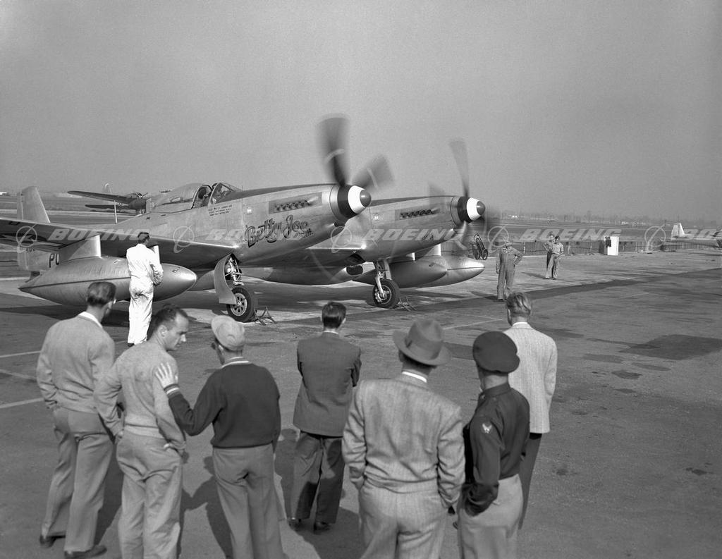 P-82 Twin Mustang Betty Joe with Women Sitting on Drop Tanks