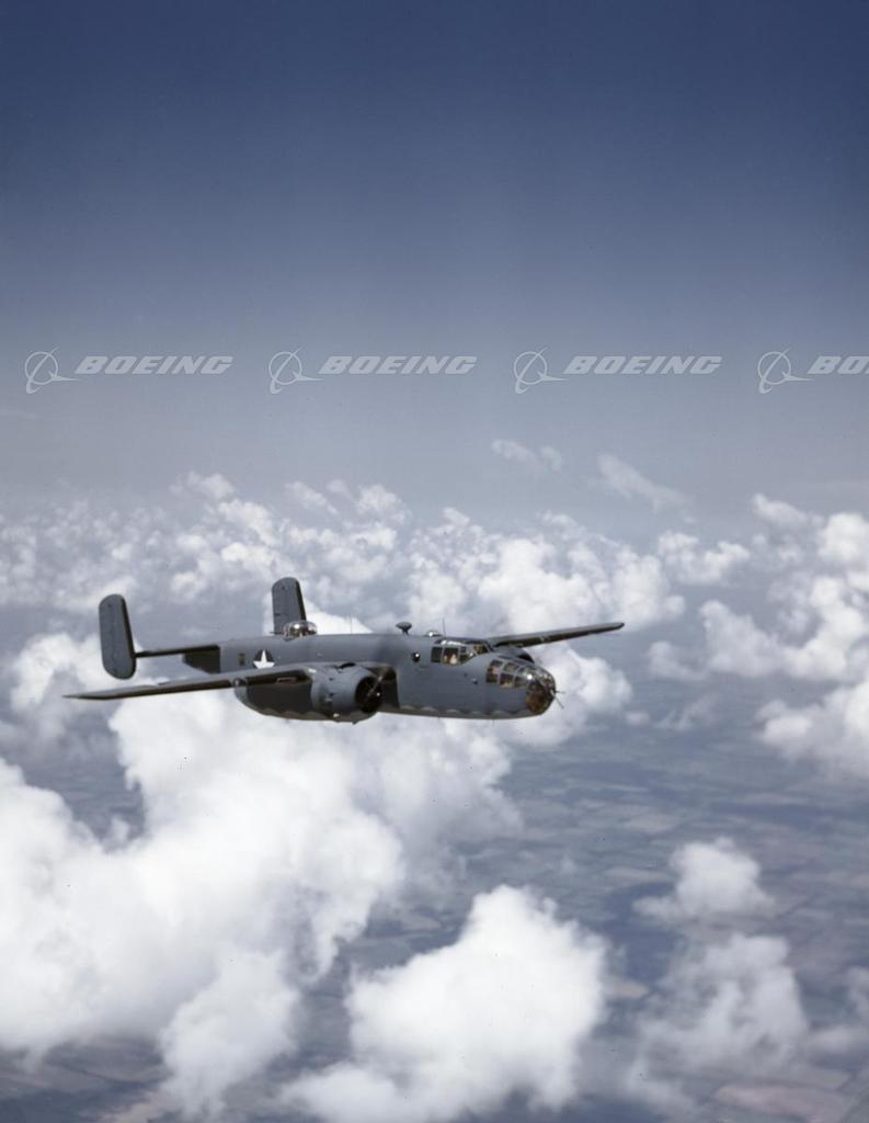 Named after General 'Billy' Mitchell, America's foremost supporter of air power, the B-25 Mitchell first flew on Aug. 19, 1940, and was the first multiengine design to go beyond the prototype stage. North American Aviation built more than 11,000 B-25s for the U.S. Army Air Forces and the U.S. Navy, which called it the PBJ, plus 50 each for China and Great Britain. The B-25 bomber had a wingspan of 67 feet and was 52 feet 11 inches long. One version, the B-25H, was the most heavily armed attack bomber of its time, with a 75-millimeter gun, up to 14 .50 caliber machine guns and 5,000 pounds of bombs carried in an internal bomb bay.