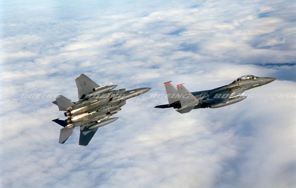 Two F-15E Strike Eagles Bank in Tandem Flight