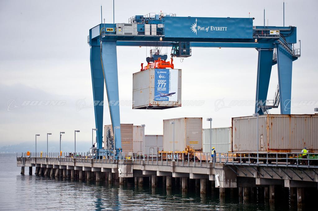 Boeing and the Port of Everett welcomed the arrival of the first shipment of parts for Boeing’s 1,000th 777 from Mitsubishi Heavy Industries, Ltd., Hiroshima, Japan. The December 2011 shipment, including body panels, was received at the Port of Everett’s Mount Baker Terminal, which handles all the oversized airplane parts for the 777 program.