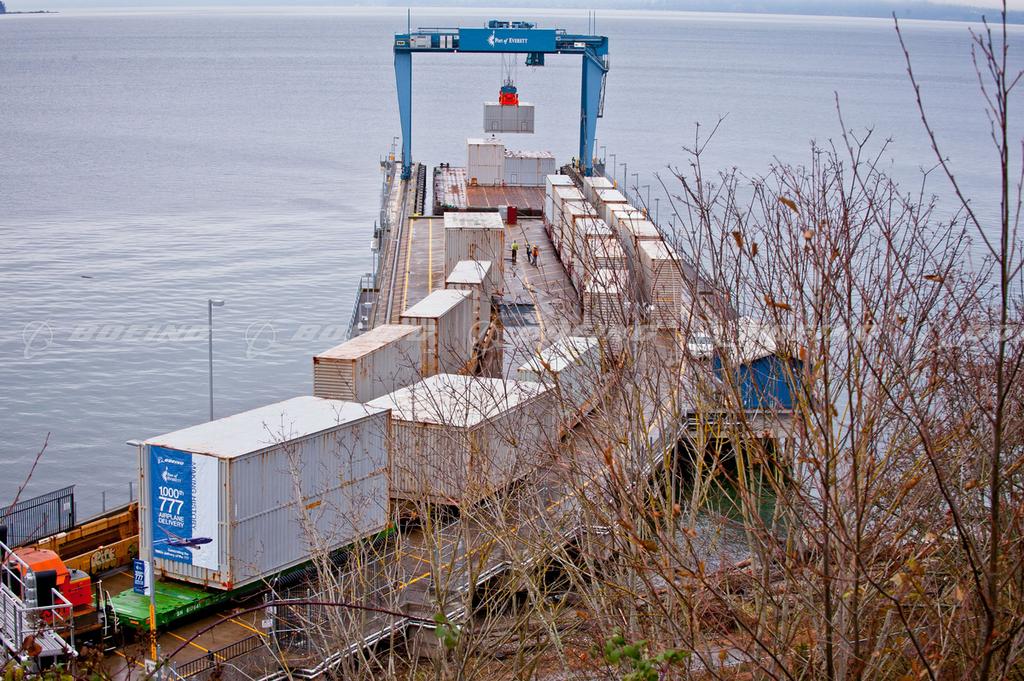 Boeing and the Port of Everett welcomed the arrival of the first shipment of parts for Boeing’s 1,000th 777 from Mitsubishi Heavy Industries, Ltd., Hiroshima, Japan. The December 2011 shipment was loaded on the train for transfer to Boeing's Everett, Wash., facility. The Port of Everett's Mount Baker Terminal handles all the oversized airplane parts for the 777 program.