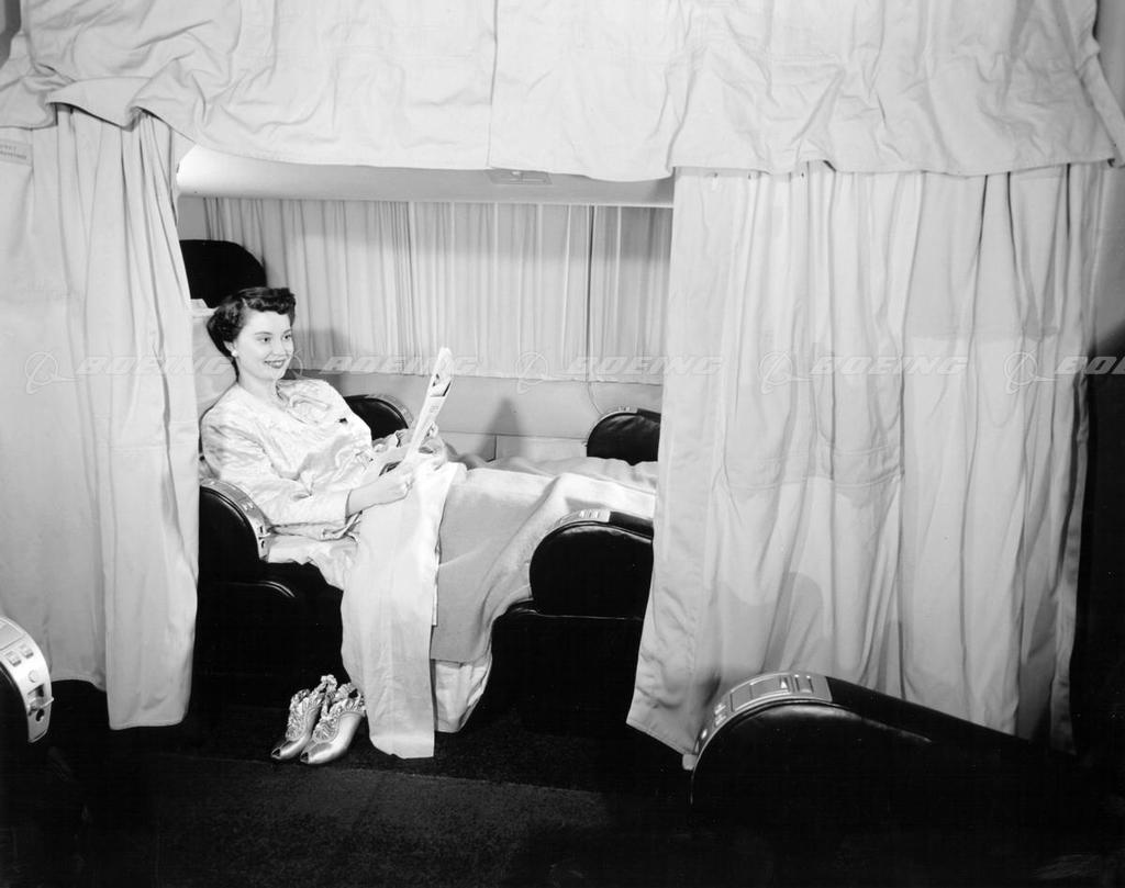 Passenger Reclines in a 377 Stratocruiser's Berthable Seat