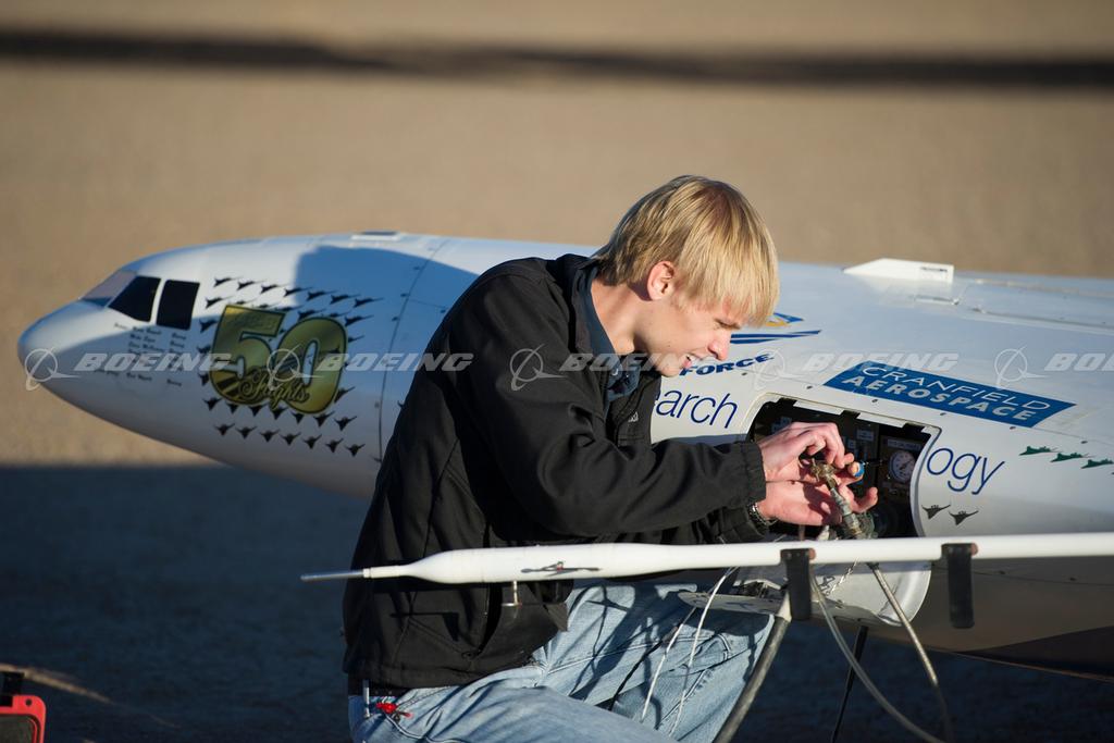 Ground Crew Prepares Boeing X-48C Blended Wing Body for flight