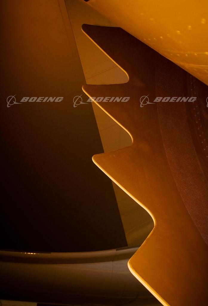 The QTD2 is a 777-300ER modified to include azimuthally varying chevrons (AVC) designed to reduce jet engine noise. Variable chevrons are saw-toothed-shaped devices at the engine exhaust streams.