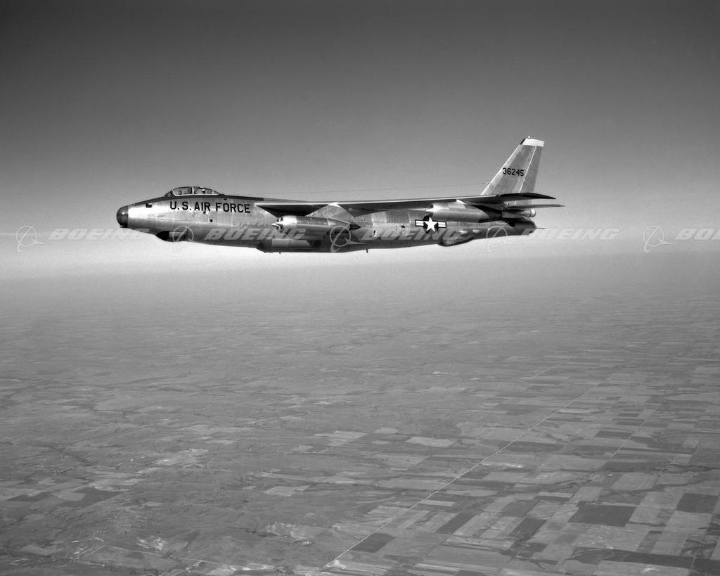 At the time of its first flight, Dec. 17, 1947, the B-47 Stratojet represented a radical departure from traditional design, and it set the design standards for all large jet aircraft until the present time. The six-engine Boeing B-47 was America's first multiengine swept-wing jet bomber. Its thin 116-foot wing was extraordinarily flexible and swept back at a 35-degree angle. Eighteen small rocket units in the fuselage provided jet-assisted takeoff (JATO), and parachutes cut its landing speeds. Later models were powered by 5,200-pound-thrust axial-flow jet engines, and top speeds were 600 mph. A total of 2,032 B-47s in all versions were built.
