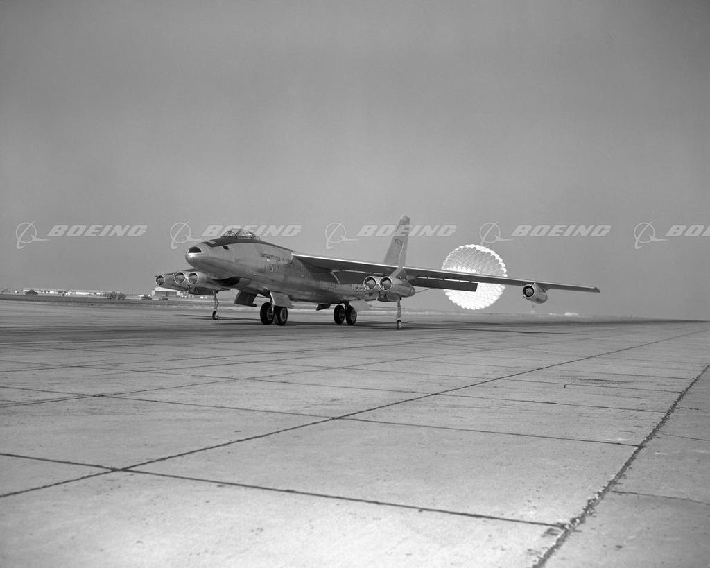 At the time of its first flight, Dec. 17, 1947, the B-47 Stratojet represented a radical departure from traditional design, and it set the design standards for all large jet aircraft until the present time. The six-engine Boeing B-47 was America's first multiengine swept-wing jet bomber. Its thin 116-foot wing was extraordinarily flexible and swept back at a 35-degree angle. Eighteen small rocket units in the fuselage provided jet-assisted takeoff (JATO), and parachutes cut its landing speeds. Later models were powered by 5,200-pound-thrust axial-flow jet engines, and top speeds were 600 mph. A total of 2,032 B-47s in all versions were built.