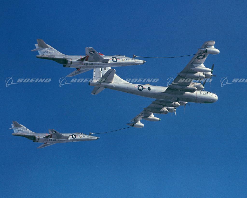 Two F-100 Super Sabres Refueling in Flight from a KB-50 Tanker
