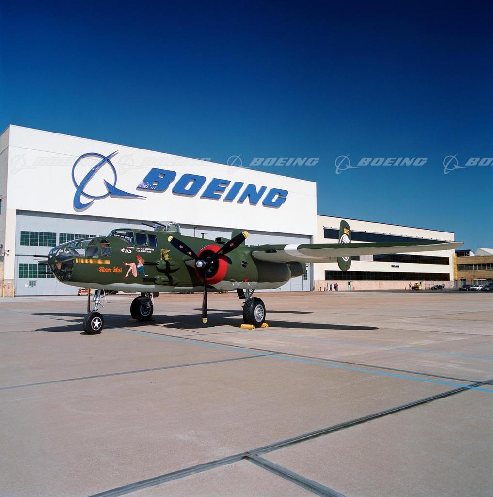 A labor of love by Boeing employees and suppliers brought new life -- and a 21st-century paint job -- to a World War II-era B-25J Mitchell bomber in 1999. Forty-seven Boeing employees in St. Louis, including managers, engineers, artists and members of the International Association of Machinists, worked 600 hours over a two-week period to make the twin-engine aircraft look new. Working after hours, they washed down the aircraft and applied about 20 gallons of paint to the wings, the fuselage, the engines, the nose art and the markings. The restored B-25, named "Show Me," is owned by the Missouri Chapter of the Confederate Air Force, an organization dedicated to the preservation of combat aircraft flown from 1939 to 1945. The aircraft is pictured here in 2004 on the Boeing McAir Ramp in St. Louis.
