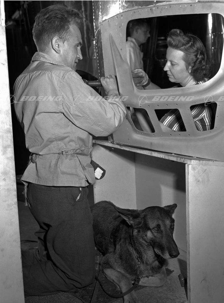 Rudy Beck, a Blind Riveter, With Seeing-Eye Dog