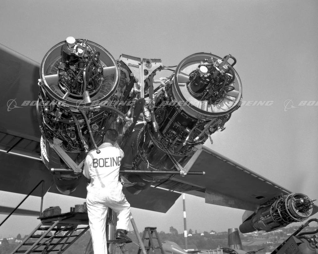 At the time of its first flight, Dec. 17, 1947, the B-47 Stratojet represented a radical departure from traditional design, and it set the design standards for all large jet aircraft until the present time. The six-engine Boeing B-47 was America's first multiengine swept-wing jet bomber. Its thin 116-foot wing was extraordinarily flexible and swept back at a 35-degree angle. Eighteen small rocket units in the fuselage provided jet-assisted takeoff (JATO), and parachutes cut its landing speeds. Later models were powered by 5,200-pound-thrust axial-flow jet engines, and top speeds were 600 mph. A total of 2,032 B-47s in all versions were built.