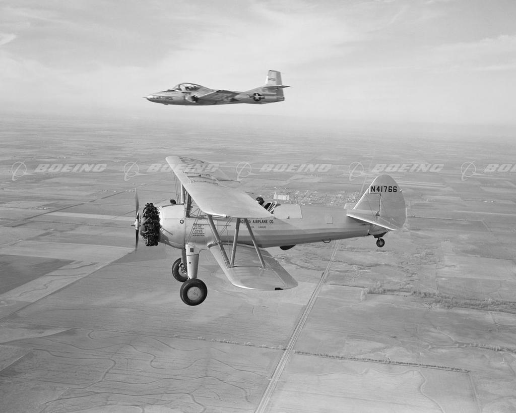 Stearman Kaydet PT-13D/T37 Flies Alongside a Fighter Jet