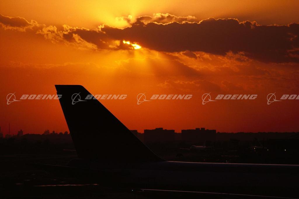 The silhouette of a 747's tail passes under a sunset sky at JFK International Airport.
