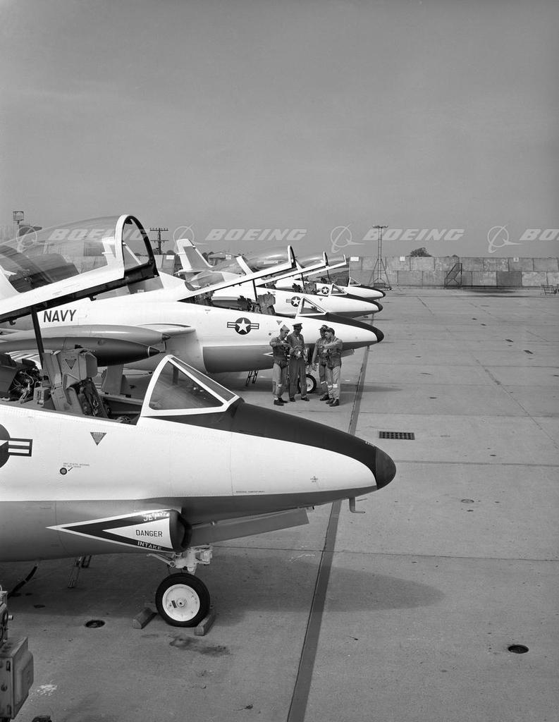 North American's T-2C Buckeye jet trainer aircraft were used by the Naval Air Training Command to conduct basic jet flight training. The T-2 established an outstanding record of safety and reliability while providing training for more than 11,000 students to pilot 18 different models of Navy jet aircraft. The aircraft was used for teaching a wide range of skills, including high-altitude, high-speed formation and aerobatic flights; basic and radio instruments; night and day navigation; and gunnery, bombing, and carrier operations. The Buckeye had a tandem seating arrangement with the rear seat elevated to provide student and instructor pilot with excellent visibility. The front and rear cockpits had duplicate controls, allowing control of the aircraft from either cockpit. The rocket-catapult ejection seats provided emergency escape capabilities. The flying characteristics, control response, low stall speed, and good stability of the T-2C combined to provide the qualities required of a good training aircraft. In addition, the T-2C was a rugged, versatile, and forgiving aircraft. The T-2 provided excellent control during takeoff and landing had performance capabilities equal to many jet tactical aircraft. The airframe was constructed to withstand carrier landings, inadvertent high G-loads, and rough landings encountered during student training.