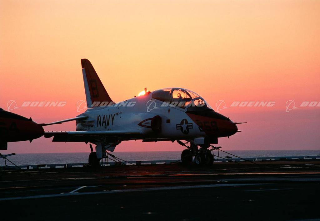 The two-seat T-45 Goshawk, a carrier-suitable version of the 1974 British Aerospace Hawk trainer, first flew in 1988. It is the centerpiece of the T45TS Training System, the first totally integrated training program for the U.S. Navy. It replaced the TA-4J Skyhawk for advanced jet pilot training and the T-2 Buckeye for intermediate training. The T-45C, with a digital cockpit, made its first flight in October 1997, and by 2002, more than 1,328 new aviators had earned their wings in the T-45. Boeing delivered the 221st and final T-45 training jet to the U.S. Navy in November 2009.
