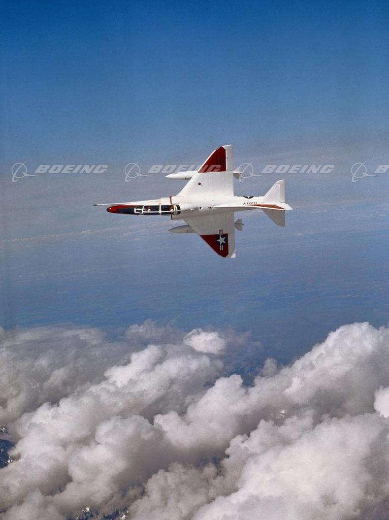 Douglas A-4 Skyhawk (1954-1979): Another successful attack aircraft from the Ed Heinemann team at Douglas was the A-4 Skyhawk. Designed for carrier operations, the Skyhawk was America’s smallest combat jet. Known as “Heinemann’s Hot Rod,” “Scooter,” and the “Mighty Midget,” it reversed the trend toward bigger and more complex aircraft in favor of durability and reliability. The A-4D first flew on June 22, 1954, demonstrating combinations of high performance and lightweight, with speed and maneuverability never before seen in an attack jet. After 1962, the joint service designation was changed to A-4. Behind the AD Skyraider, the A-4 Skyhawk was the most numerous postwar combat aircraft built by Douglas. During its long service career, the U.S. Navy and Marine Corps and the air arms of six other nations flew the A-4 The Skyhawk saw combat in Vietnam, the Middle East, the Falkland Islands, and the Persian Gulf. For 12 years, from 1974 to 1986, the A-4 Skyhawk served with the Navy’s Blue Angels flight demonstration team. In 1979, twenty-five years after its first flight, the last of 2,960 A-4s was delivered. Two-seat trainer versions included the TA-4F, TA-4J and the TA-4K Series. In addition to its primary role as a jet trainer, the TA-4 retained the A-4’s combat capabilities with bombs, rockets, missiles and guns. The TA-4 series had a slightly longer fuselage but carried less internal fuel than the A-4 attack bomber series. The first of the A-4 jet trainer series was delivered to the U.S. Navy in February 1966. A total of 555 TA-4 jet trainers were built. An additional 23 TA-4s were modified from A-4 airframes.