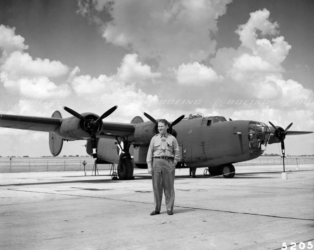 Douglas-Tulsa chief test pilot John Carroll stands in front of a B-24 Liberator, purportedly the first B-24 to roll off the line at Douglas Tulsa.