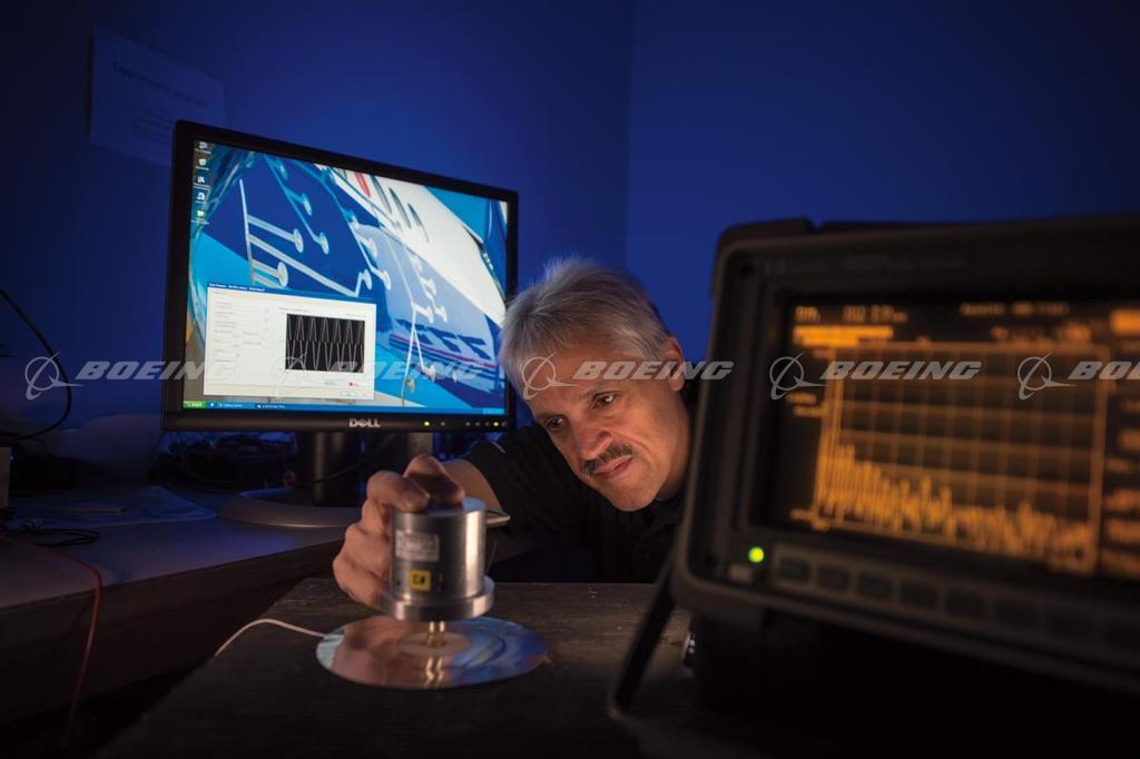 Jim Underbrink, of Boeing Test & Evaluation Instrumentation and Data Systems, uses a calibration device to determine sensitivity on a microelectromechanical system (MEMS) microphone that was tested as part of the Boeing ecoDemonstrator program. Boeing is the only major airplane manufacturer with a test plane dedicated exclusively to evaluating environmentally progressive technologies.