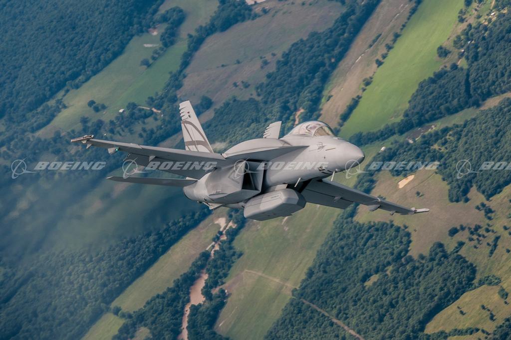 F/A-18E/F Advanced Super Hornet on test flight with conformal fuel tanks and Enclosed Weapons Pod.