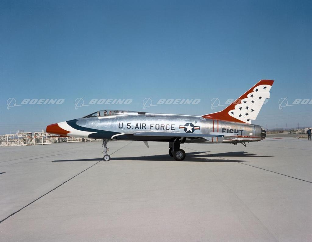The F-100 Super Sabre was a sleek, swept-back-wing fighter that gave the United States a supersonic Air Force. Since May 1953, when the first prototype model, the YF-100, bettered the speed of sound on its first flight, the versatile fighter set numerous records for speed, endurance, range and maintenance. Late production models of the F-100D and F-100F had the capability of being launched from remote areas in the manner of manned missiles. Of the 2,290 Super Sabres produced, 1,274 F-100Ds included the first autopilot designed for a supersonic jet. Powered by a 16,950-pound-thrust afterburning jet engine, the F-100 was armed with four 20-millimeter cannons, two GAM 83A Bulldog missiles, four Sidewinder missiles, rockets, special stores, and/or 7,040 pounds of bombs.To demonstrate the ability of its pilot and aircraft, the Air Force chose F-100 Super Sabres to perform throughout the world in aerial precision demonstration flights. The famed Thunderbirds, a four-man aircraft team, were viewed by over 19 million people as the storied pilots performed intricate precision maneuvers at low altitude.
