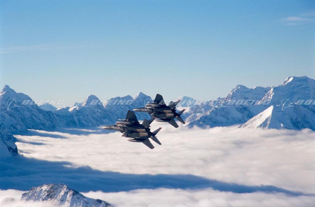 Twin F-15E Strike Eagles in Flight over Alaskan Wilderness