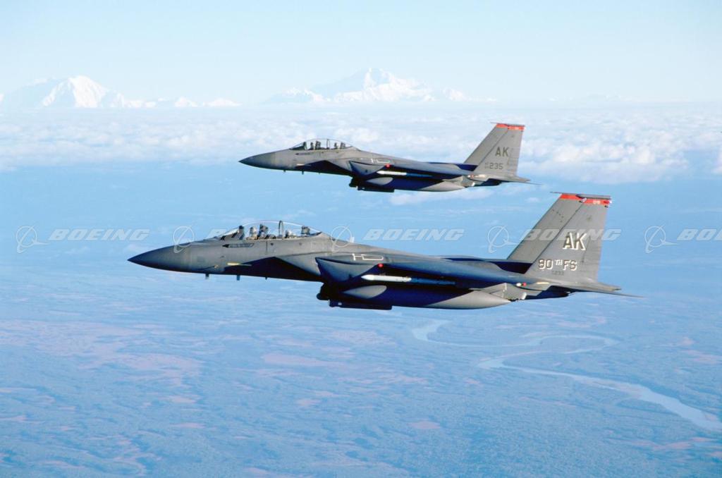 Twin F-15E Strike Eagles in Flight over Alaskan Wilderness