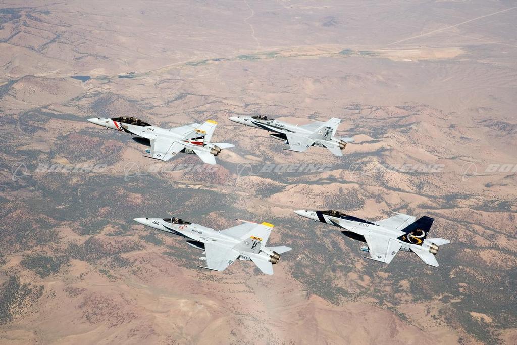 Two F/A-18C Hornets with a F/A-18E and F/A-18F Superhornet in Flight over Nevada