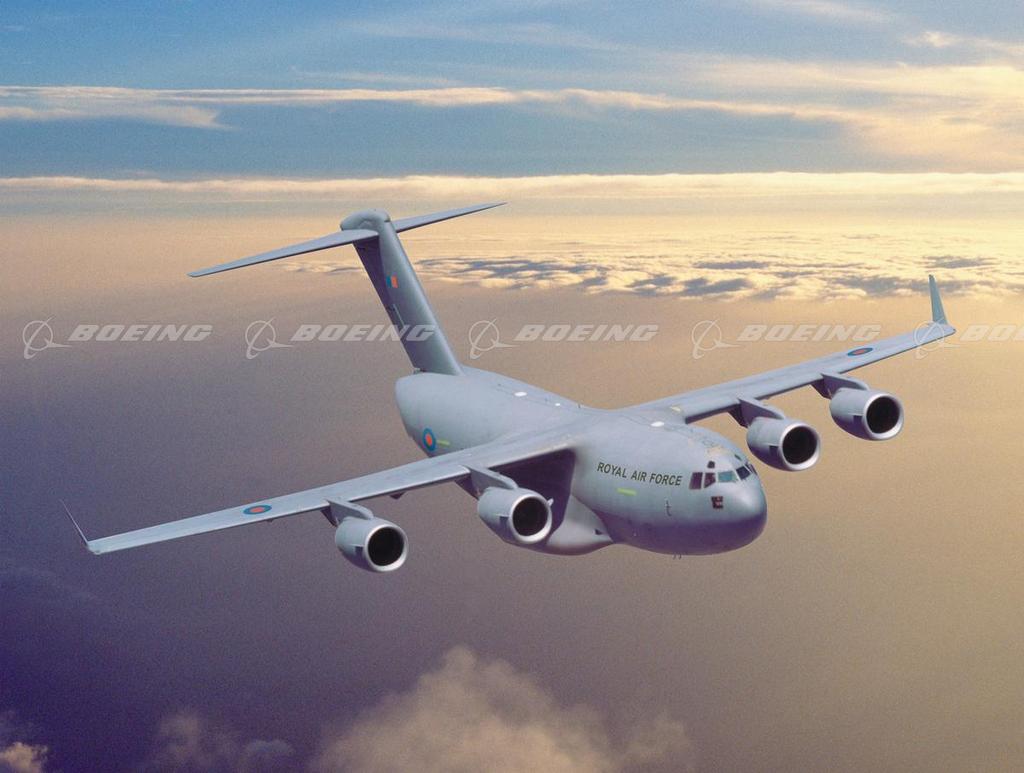 Boeing C-17 Globemaster III The United Kingdom Ministry of Defense has announced that it intends to lease four Boeing C-17 Globemaster III cargo aircraft for the Royal Air Force, making Britain the first international customer for the airlifter. The C-17 is a jet-powered cargo airplane capable of carrying up to 169,000 pounds intercontinental distances, yet can land on small austere fields as short as 3,000 feet.