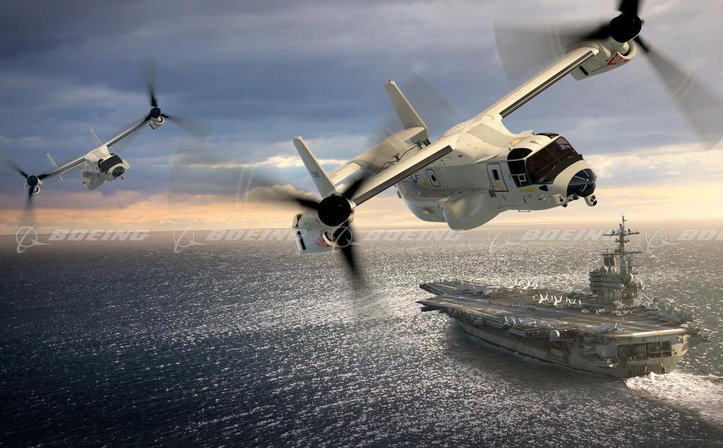 The CMV-22B, depicted here, is the latest V-22 variant that Boeing began assembling in May 2018 following three years of development. The CMV-22B will enable the Navy to efficiently transport cargo from shore to aircraft carriers.