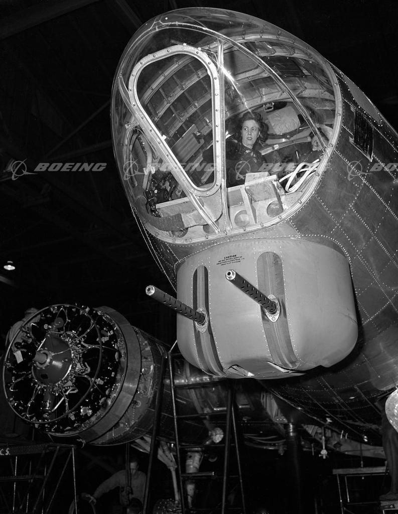 Latest addition to the famed Boeing Fortress family is the B-17G, one of which is seen here nearing completion in the final assembly area of the Boeing Aircraft Company, Seattle, WA. Distinguishing characteristics of the B-17G is the twin-gun "chin-turret" located beneath the plastic nose. Mounting two 50 caliber machine guns with a firing range of about 1,000 yards, the new turret is designed to parry frontal attacks by enemy fighter planes.