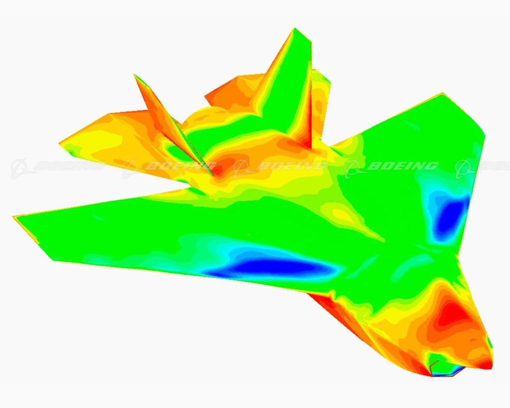 This image of the Boeing Joint Strike Fighter shows surface pressures on a 5%-scale wind tunnel model at mach 0.80 and 12 degrees angle of attack. This data was used as input to FlightLoads software.