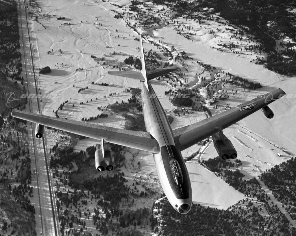 At the time of its first flight, Dec. 17, 1947, the B-47 Stratojet represented a radical departure from traditional design, and it set the design standards for all large jet aircraft until the present time. The six-engine Boeing B-47 was America's first multiengine swept-wing jet bomber. Its thin 116-foot wing was extraordinarily flexible and swept back at a 35-degree angle. Eighteen small rocket units in the fuselage provided jet-assisted takeoff (JATO), and parachutes cut its landing speeds. Later models were powered by 5,200-pound-thrust axial-flow jet engines, and top speeds were 600 mph. A total of 2,032 B-47s in all versions were built.