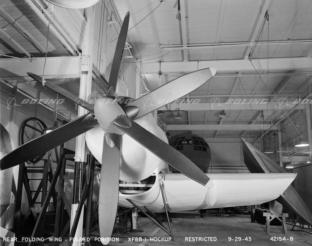 The XF8B-1 fighter-bomber was the heaviest carrier-based airplane built before the end of World War II. The XF8B-1 could be flown as a torpedo bomber and, because of its single-seat configuration, could also be used as a fighter. Because of its size and great horsepower, the XF8B-1 used an unusual dual six-blade contrarotating propeller. It carried bombs internally and extra fuel externally, and its six machine guns were mounted inside the folding wings. Only three XF8B-1s were built. The aircraft never went into major production because changing wartime strategy required that Boeing concentrate on building land-based large bombers and transports.