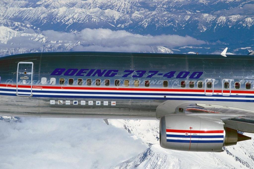 Development of the quieter, more fuel-efficient CFM56-3 series of engines allowed Boeing to improve its most popular jetliners and produce the advanced-technology 737-330, -400, and -500. The engines are larger and mounted forward of the wing struts instead of tucked directly under the wing as in the -100 and -200 versions. Advancements on the new-generation 737s included a stregthened wing to accomodate greater gross weight, tip extensions to the wings and horizontal stabilizers, and stregthened wheels, tires and brakes. The 737-200, -300, -400, -500 have the same handling characteristics so that pilots can use the same Type rating to fly all of them. Airlines' spares inventory and maintenance are simplified by making a substantial number of replaceable parts on the -300, -400, -500 identical to those used on the -200. The 737-400 is about 10 feet longer than the 737-300. It holds 19 more passengers and has a gross weight of up to 150,000 pounds, while retaining the same fuel efficiency, low noise, and low operating costs as its predecessor.