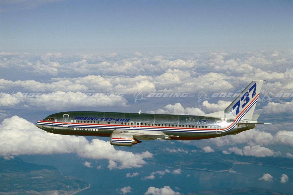 Development of the quieter, more fuel-efficient CFM56-3 series of engines allowed Boeing to improve its most popular jetliners and produce the advanced-technology 737-330, -400, and -500. The engines are larger and mounted forward of the wing struts instead of tucked directly under the wing as in the -100 and -200 versions. Advancements on the new-generation 737s included a stregthened wing to accomodate greater gross weight, tip extensions to the wings and horizontal stabilizers, and stregthened wheels, tires and brakes. The 737-200, -300, -400, -500 have the same handling characteristics so that pilots can use the same Type rating to fly all of them. Airlines' spares inventory and maintenance are simplified by making a substantial number of replaceable parts on the -300, -400, -500 identical to those used on the -200. The 737-400 is about 10 feet longer than the 737-300. It holds 19 more passengers and has a gross weight of up to 150,000 pounds, while retaining the same fuel efficiency, low noise, and low operating costs as its predecessor.