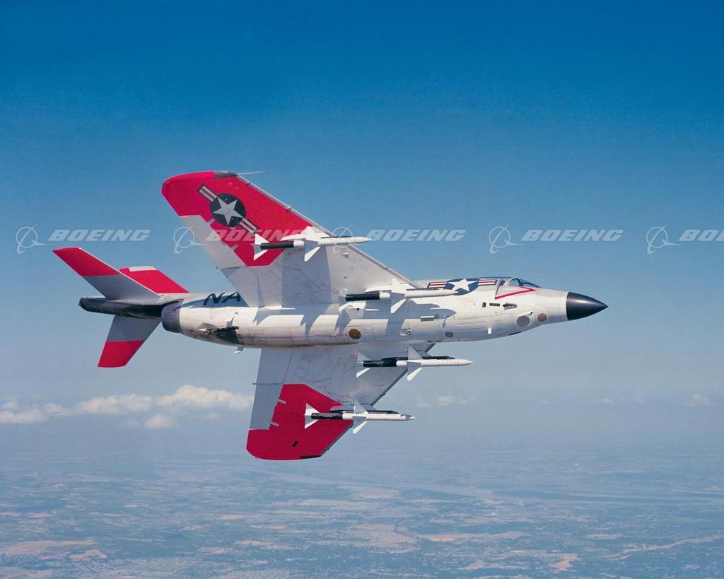 McDonnell F3H Demon (1951-1959): The F3H Demon was the first swept-wing jet fighter designed by McDonnell Aircraft and the only single-engine carrier based fighter built by the company. Design began in 1949, and the Demon made its first flight on August 7, 1951. However, development of the plane’s original engine was delayed and in 1953 the Demon was redesigned around a more powerful engine. The new engine greatly improved the plane’s performance and in 1956 the Demon was fully qualified as a first line fighter for the U.S. Navy. The F3H-2M Demon, first flown in 1955, was the first aircraft designed to be armed only with missiles rather than guns. In 1958, flying day and night, the Demon provided all-weather fleet defense during critical operations over Lebanon in the Mediterranean, and off Quemoy Island near China in the Far East. McDonnell Aircraft delivered the last of 522 F3H Demons in 1959.