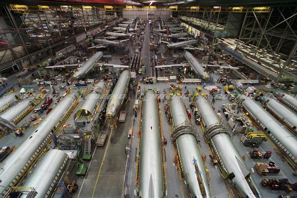 Production of 737s at Boeing's Renton, WA factory. In 2002 the 737 manufacturing process converted to a moving line system, replacing the station to station method of assembly pictured here.