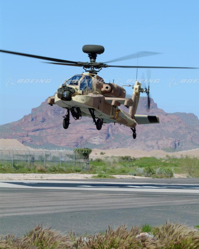 Prior to being delivered to the Israel Air Force, the AH-64D Apache Longbow helicopter hovers over the flight line at the Boeing facility in Mesa, Arizona where the helicopters are built.