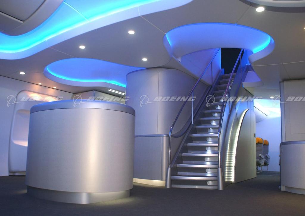 The 747-8 Intercontinental features a new interior with 787-like amenities. The interior incorporates new mood-lighting technology, as well as new lavatories developed for the 787. The newly designed entryway of the 747-8 takes passengers past a concierge station into the elegantly contemporary new interior. A dramatic stairway leads to the upper deck. The new curved, upswept architecture gives passengers great space and comfort, with more room for personal belongings.